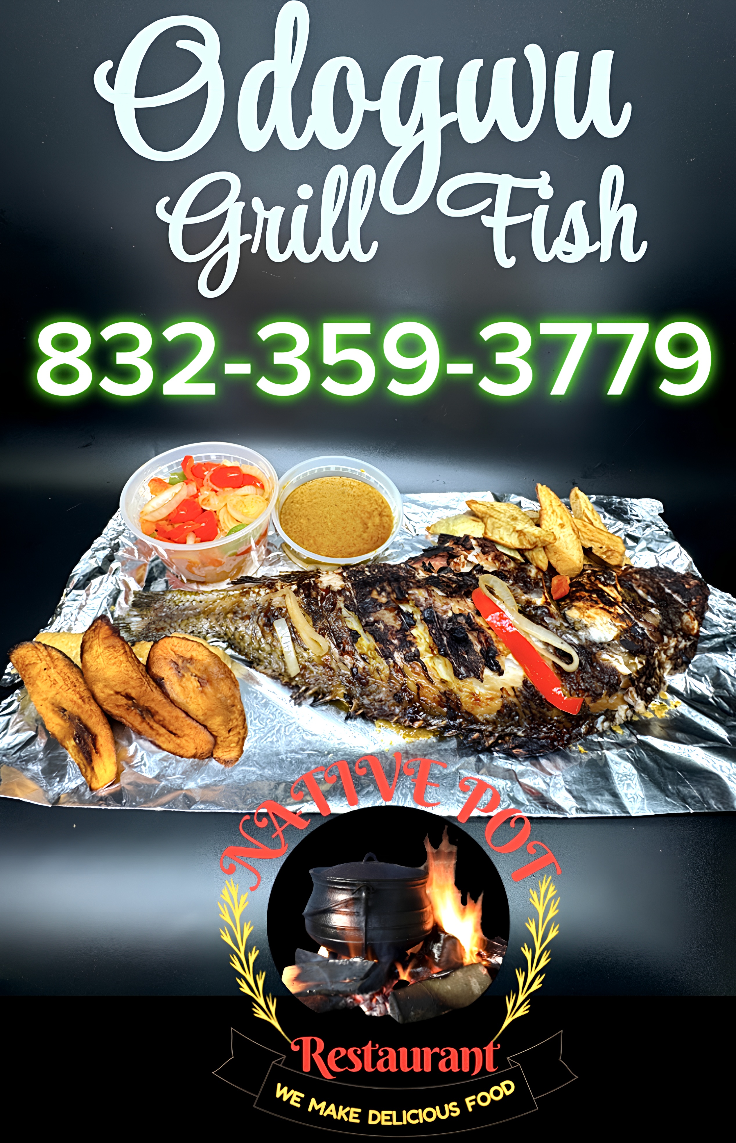 A LARGE DRUM FISH WELL MARINATED WITH SOME AFRICAN SPICES, GRILLED WITH SOME SPECIAL SPICES TO MEET YOUR TASTE BUD AND EXPECTATIONS, JUST THE WAY YOU WILL LIKE IT.